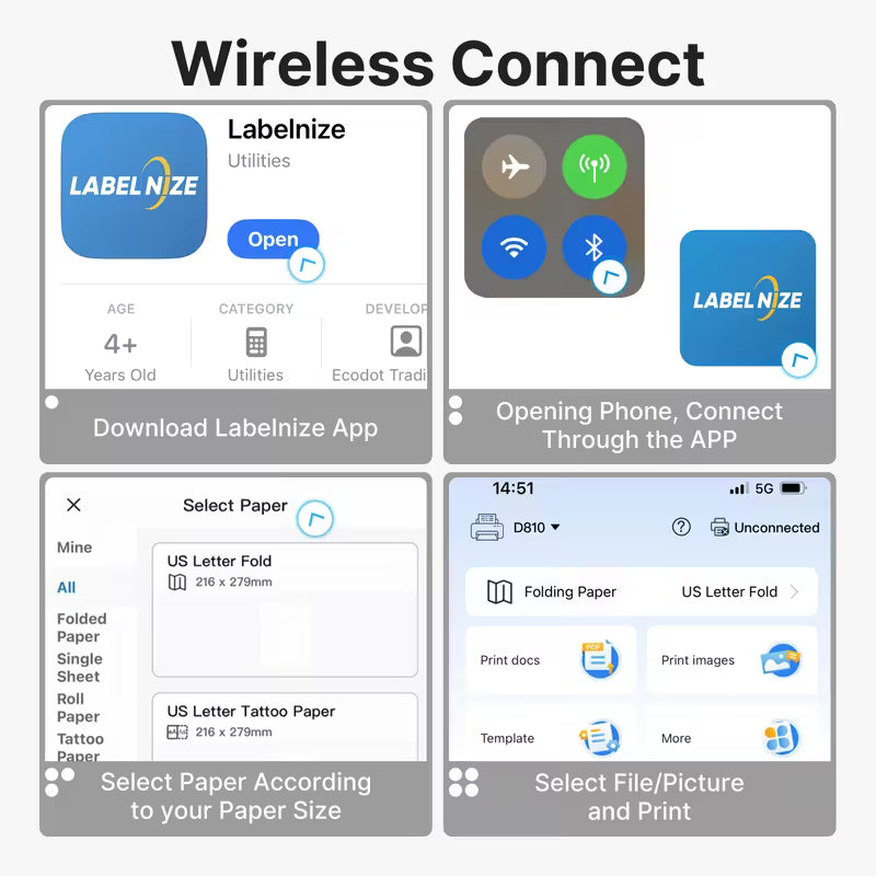 Der Drucker funktioniert nahtlos mit allen gängigen Android und iOS Geräten. Einfach verbinden, App öffnen und losdrucken. Diese universelle Kompatibilität macht den Drucker ideal für Zuhause, Büro oder unterwegs
